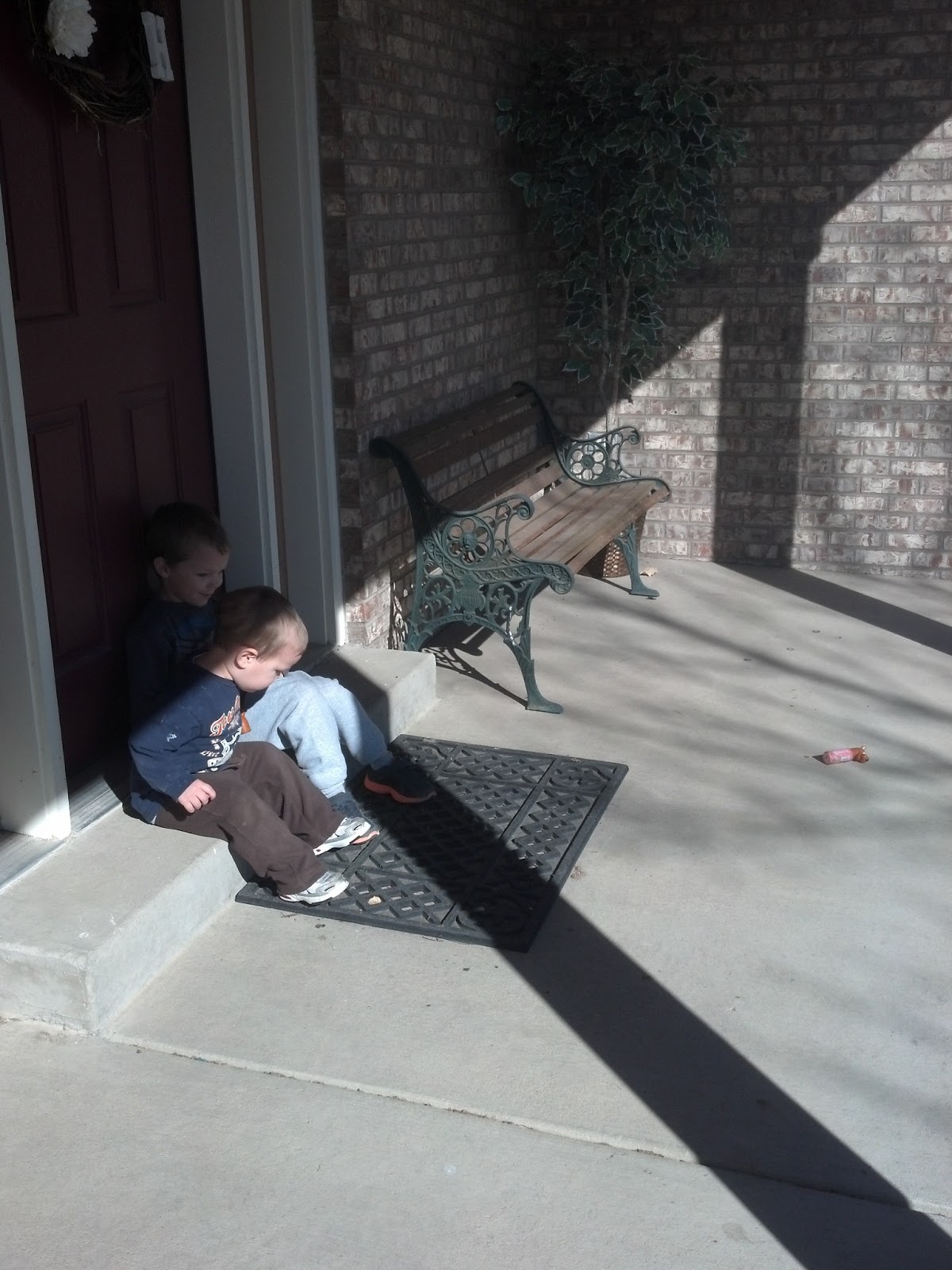 One of our first (pretend) spring days, on the front porch, blowing bubbles.